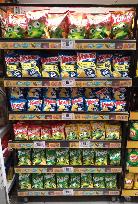 – Seguindo o fluxo do corredor, inicie a exposição por salgadinhos diversos como conchas, redinhas e bolinhas de sabores como presunto e queijo, posicionados à altura dos olhos. Logo abaixo devem ficar os anéis de cebola e itens de outros sabores