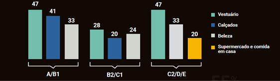 Além disso, muitos lazeres, como uma viagem ou ida a um restaurante, foram substituídos pelo consumo no lar de um queijo, vinho ou chocolate, por exemplo, diversões que cabem no bolso, conforme reforçam dados da pesquisa global da McKinsey de Percepção do Consumidor 2023, que mostra as indulgências de cada classe social. Nas classes C, D e E, as categorias top 3 na intenção de “esbanjar” incluem supermercado e alimentos em casa, itens não citados pelas classes A e B (vide gráfico).