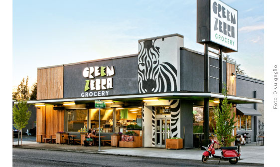 A pequena Green Zebra Grocery , de Portland, EUA, tem logomarca e layout de fachada que mostram com clareza o seu posicionamento: entregar natureza e saúde de maneira descontraída. A lojinha, localizada estrategicamente em uma esquina, revela ainda seu caráter de conveniência com a entrada e a saída bem definidas. O mix traz produtos frescos, orgânicos, refeições quentes, sanduíches personalizados.
