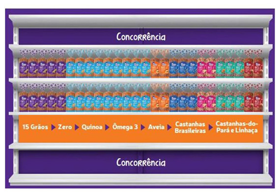 2. Seguindo o fluxo do corredor, a ordem dos produtos deve ser a seguinte: 15 Grãos, Zero – ambos com várias frentes –, Quinoa, Ômega 3, Aveia, Castanhas Brasileiras e Castanha-do-Pará e Linhaça.