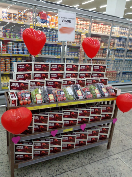 Pontos extras também são fundamentais para gerar compra por impulso. Isso pode ser feito, por exemplo, posicionando o Fondue de Chocolate Vigor junto a frutas (foto) e com o Fondue de Queijo Vigor perto dos pães. O cross merchandising com réchauds também gera associação direta por parte dos shoppers e estimula um aumento ainda maior no tíquete médio.