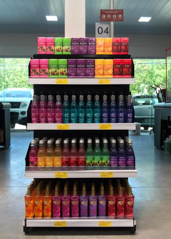 Procure expor as Águas Perfumadas ao lado de desodorantes e loções hidratantes, aproveitando o momento da compra por impulso pelo público.