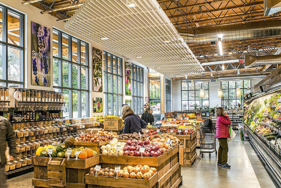 Com projeto ancorado na sustentabilidade, uma loja do Astoria Co+Op, no Oregon (EUA), proporciona uma experiência de compra convidativa. Por meio da estética do espaço e iluminação natural, valoriza a integração com a região onde está inserida. O imóvel tem teto alto e grandes janelas, o que deixa os amplos corredores repletos de luz natural. As estruturas suspensas de madeira foram adicionadas estrategicamente para marcar departamentos específicos da loja de forma aconchegante. Os elementos sustentáveis implementados incluem painéis e móveis de madeira recuperada e iluminação com eficiência energética.
