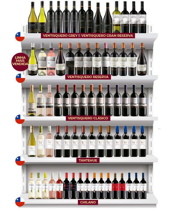Um dos destaques é Ventisquero Reserva, líder em vendas entre os vinhos chilenos na faixa de preço ao consumidor entre R$ 60 e R$ 80. Com vendas expressivas, seus rótulos são essenciais ao sortimento do varejo alimentar por contribuir na elevação do tíquete médio e das margens obtidas.