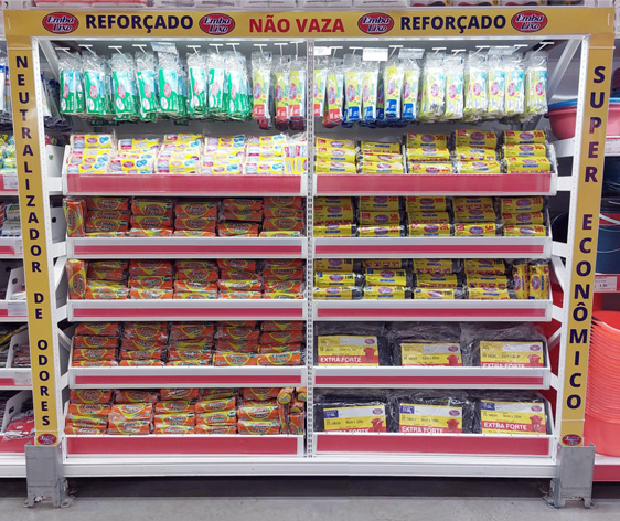 A exposição continua com os sacos para lixo com alças e as embalagens econômicas. Por fim, na parte mais baixa, ficam as versões tradicionais da categoria.