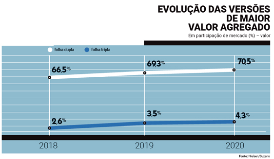 Em Campos dos Goytacazes (RJ), o Grupo Barcelos , que atende um público diversificado, viu a categoria se comportar nos extremos em 2020: enquanto no atacarejo cresceu 7,9%, nas lojas de varejo caiu 8,1%. O destaque no cash ficou com papel-toalha (alta de 38,5%) e lenço de papel (alta de 496,5%). Já guardanapo caiu nos dois formatos. “Neste ano, a empresa está apostando um pouco mais em produtos de alto valor agregado, como papel higiênico com folha tripla e papel ecológico, para obter melhores resultados”, conta Mauricio Cerrutti, presidente da empresa, que atua com bandeiras como Superbom, Green Market e Barcelos Atacadista.