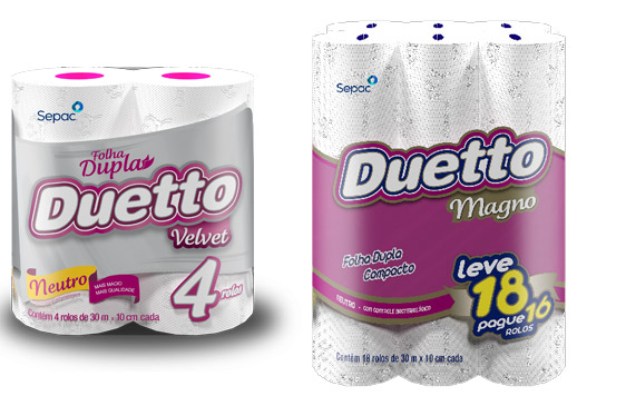Com atuação nos segmentos de papel higiênico, guardanapo e toalha de papel, a Sepac investe constantemente em tecnologia e inovação. A empresa afirma que detém a liderança no Sul do Brasil com a marca Duetto, no segmento de papel higiênico de folha dupla. Já em folha simples, a liderança é obtida com a linha Paloma no interior de SP, DF, GO e MS. Entre suas apostas, estão Duetto Magno (foto), uma versão compacta do folha dupla na versão 18 rolos que utiliza menos plástico em sua embalagem, além do Duetto Velvet (foto). A linha traz uma proposta de maior maciez, sendo que o conceito remete à suavidade, nobreza e classe.