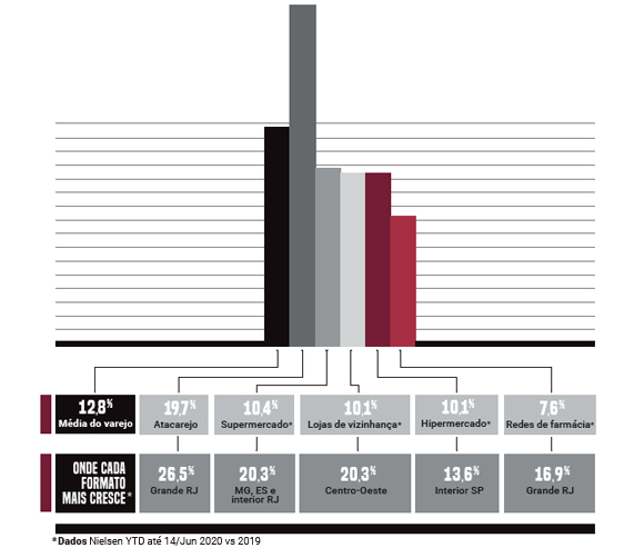 Com base nas vendas de 150 cadeias nacionais dos diferentes formatos do autosserviço, atacarejo e redes de farmácias, a Nielsen , empresa global de mensuração e análise de dados, mapeou a movimentação no setor durante os seis primeiros meses deste ano. O levantamento aponta, com detalhes, quais categorias e canais crescem de forma mais destacada na comparação com o mesmo período de 2019.