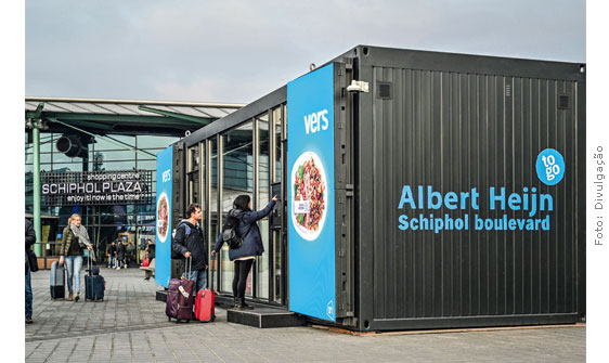 A rede Albert Heijn , com quase 1.000 lojas na Holanda e Bélgica, está testando uma unidade digital de apenas 14 m2, no aeroporto Schiphol de Amsterdã.