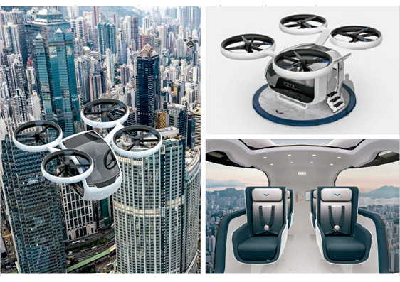 Um drone de passageiros deverá sair da prancheta do italiano Andrea Ponti para os céus de Hong Kong e região. A ideia é que seja usado em viagens envolvendo nove municípios industriais. Não tripulado e totalmente elétrico, o drone se assemelha a um jato particular. Tem um corredor central e quatro assentos individuais, além de telas que exibem as informações de decolagem, voo e pouso. Não faltam espaços para bagagens, nem bancos reclináveis e almofadas de couro.