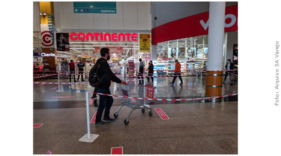 No hipermercado Continente (fotos), também havia limitação para entrada. "A loja é grande e tem mais de uma porta de entrada e saída. Mas só uma estava liberada. Acredito que era para facilitar o processo de controle. No chão, adesivos desde a entrada da loja, indicando onde devemos nos posicionar para manter distância segura dos outros clientes", afirma