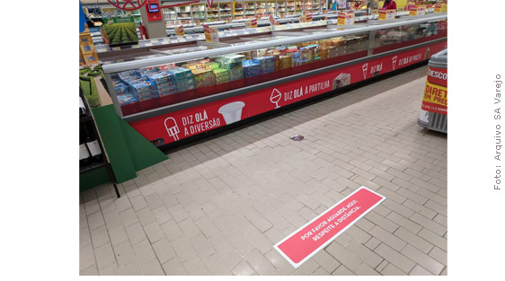 Os adesivos também foram colocados em áreas como peixaria, açougue de atendimento e nos balcões refrigerados, além dos checkouts. A ideia é que cada cliente mantenha distância do funcionário e dos demais consumidores. "As duas lojas estavam bem abastecidas nesse dia", lembra João Paulo.