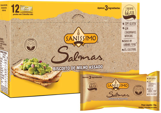 Salmas: biscoito de milho assado, vegano, sem glúten, não tem conservantes artificiais, baixo nível de gorduras totais, 0% colesterol e 66 calorias por pacote. Inicialmente está sendo distribuído em São Paulo, Rio de Janeiro e nos Estados do Sul