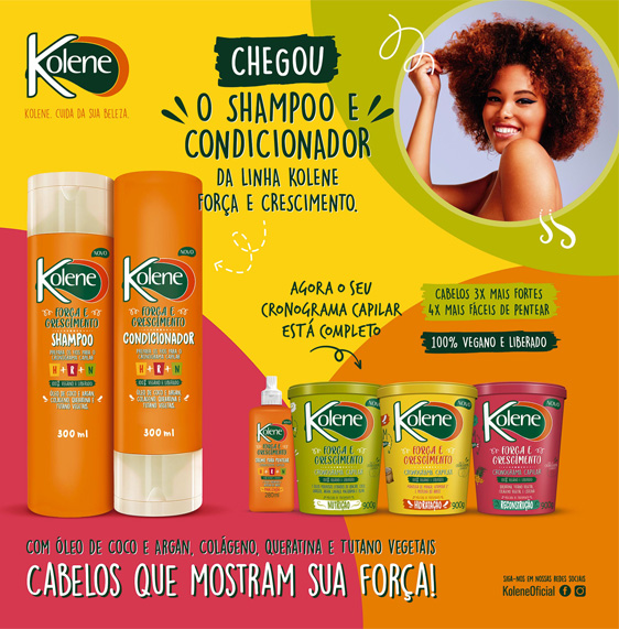 Agora, Kolene Força e Crescimento é um tratamento capilar completo para quem quer seguir um cronograma capilar, da lavagem à finalização dos fios. A Linha é ideal para quem quer manter os cabelos saudáveis com foco no crescimento, sendo indicada para quem está no processo de transição capilar, já que possui ação anti-frizz e ingredientes que garantem movimento, independente da textura e curvatura do fio. Todos os produtos possuem fórmula 100% vegana, liberada e não testada em animais. Não deixe faltar nas suas lojas.