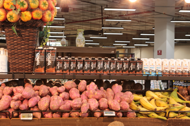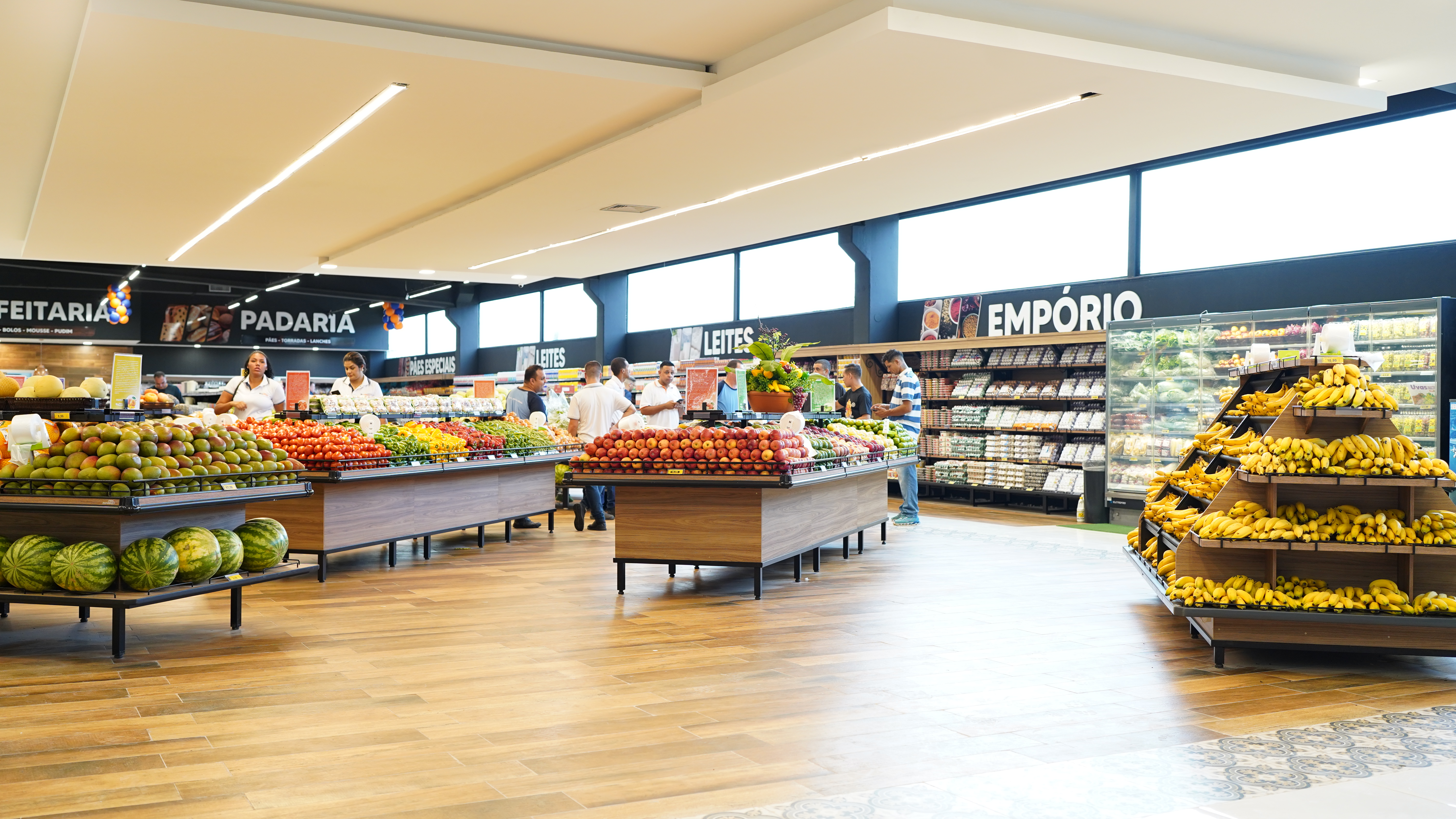 No Big Mart , a seção de hortifrúti tem um grande espaço para cada tipo de produto em uma área ampla que interaje com categorias como ovos, leites e padaria, garantindo a visibilidade das opções.