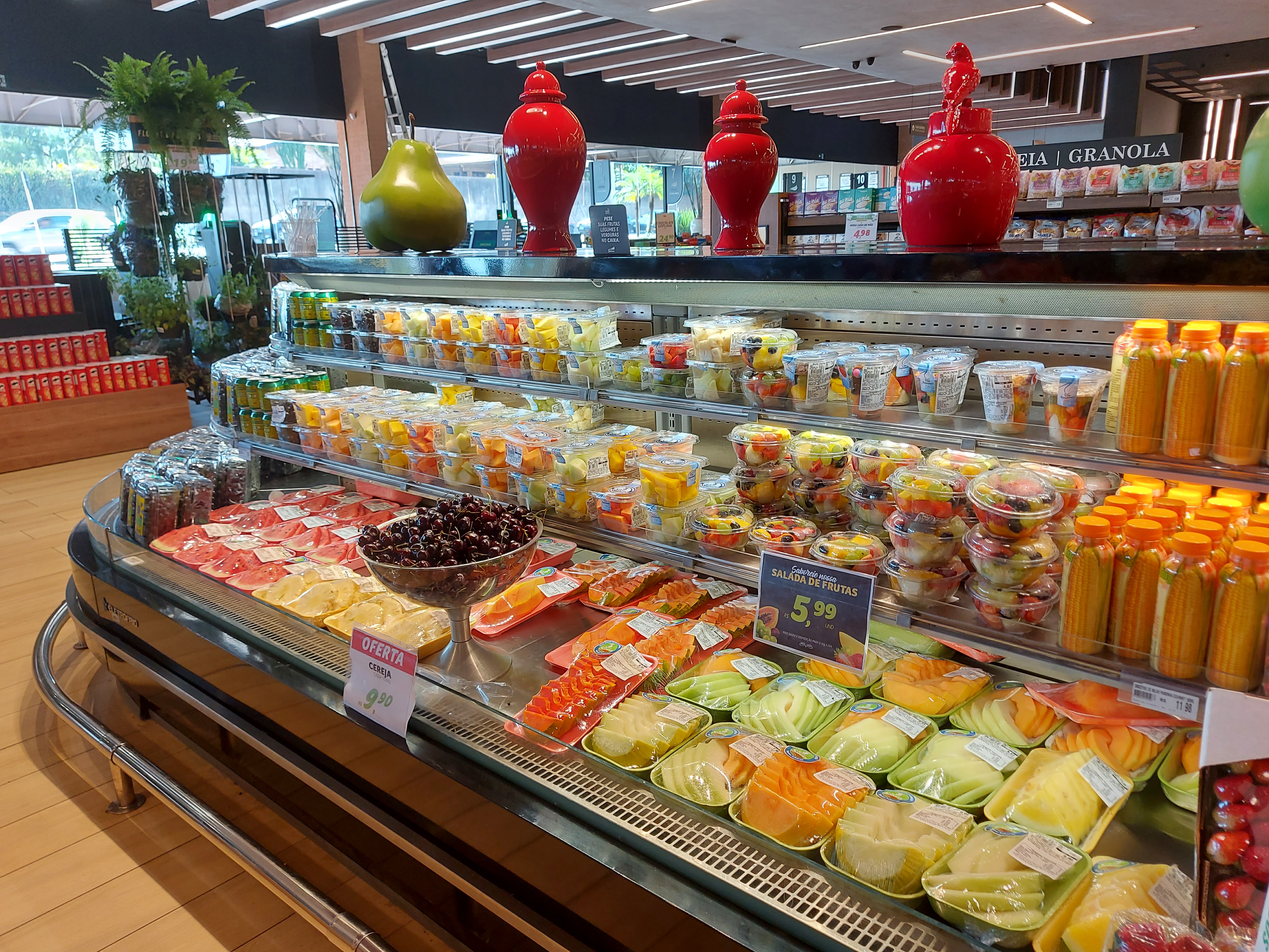 Uma exposição bem estruturada, com iluminação adequada, ajuda a valorizar o produto. Frutas prontas para o consumo e sucos naturais também enriquecem a seção e ajudam a impulsionar o tíquete médio.