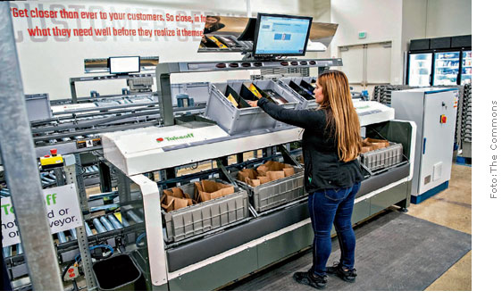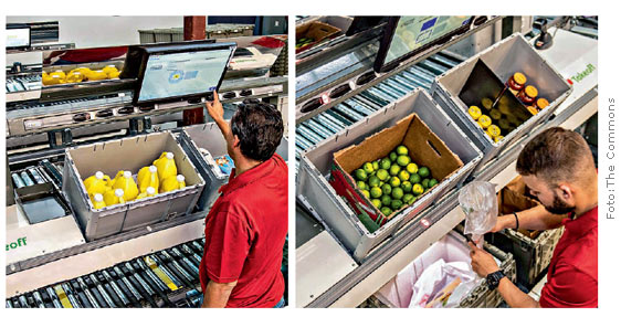 Na solução da Takeoff Technologies, os produtos são transportados por esteiras, a partir de um sistema que considera peso de cada item e temperatura de perecíveis, e separa os produtos por categoria