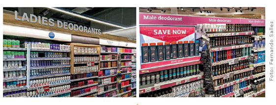 No setor de cosméticos e itens de higiene pessoal, os supermercados sul-africanos adotam clara separação entre gôndolas com produtos masculinos e aquelas com SKUs femininos, sempre com a divisão destacada na comunicação visual. Além de garantir boa organização, facilita para cada shopper interagir com um sortimento de seu interesse.