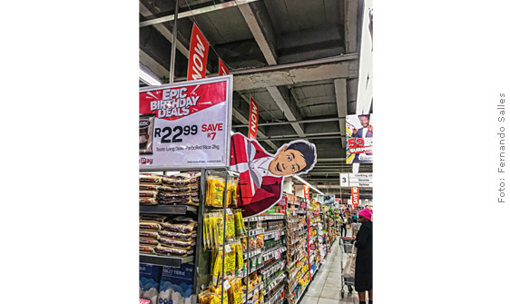 Na cidade de Johannesburgo, grande parte da população das classes média e alta vive em amplos condomínios de casas. Para esse público, fim de semana, principalmente domingo, é o momento de curtir sua residência com a família e de aproveitar o espaço ao ar livre do qual dispõe. Essa ilha de produtos, montada por uma das lojas da rede Pick n Pay, reúne diversos itens presentes nesse estilo de vida, como utensílios para churrasco, bolas de rugby – esporte muito popular por lá –, cadeiras para ambiente externo, snacks, bebidas e copos.