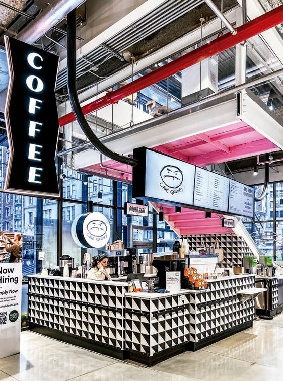 A unidade localizada no número 63 da Madison Avenue possui 5.016 m2 distribuídos em dois andares. “Trata-se de uma solução de real state absurdamente poderosa. O custo do aluguel do térreo corresponde a 10% do valor do andar de cima”, explica Júlio Takano, sócio da Varejo180 e CEO da KT Kawahara Takano Arquitetura de Negócios. O custo permite ao Whole Foods não só tornar o empreendimento mais atrativo para o consumidor como executar a loja na parte superior, utilizando o térreo como um espaço de boas-vindas para o cliente. Ali está presente o Café Grumpy (foto acima), uma empresa local, que pertence a mulheres, certificada pela operação independente e conhecida pelo atendimento que brinca com o mau humor. Também está localizado nesse nível o ZA’ATAR by Whole Foods, voltado à alimentação do Oriente Médio, e uma área de Grab & Go, para compras rápidas de comida pronta. Mas o objetivo principal do conceito aplicado à unidade é justamente reter o consumidor por mais tempo. Takano ressalta que todo o projeto foi pensado com essa finalidade, começando pela possibilidade de o cliente enxergar da rua que existe um Whole Foods também na parte superior. E é por isso que no andar de cima fica o restante do supermercado, incluindo as áreas de refeições prontas, como a cozinha gourmet, a área de gastronomia japonesa e mediterrânea, buffets de salada, de molhos e de acompanhamentos e o de sopas, além, é claro, de um espaço ampliado para o cliente saborear seu prato dentro da própria loja. A presença dessas soluções de alimentação atrai o cliente e faz com que ele passe pelas demais áreas da loja, como a de flores, de beleza, a peixaria, o açougue etc. A unidade também dedica maior espaço a probióticos – entre outros produtos com apelo à saudabilidade –, cujo consumo vem crescendo significativamente.