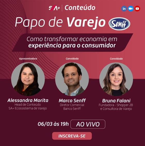 O programa inicia ao vivo às 19h e será apresentado por Alessandra Morita, head de conteúdo da SA+ Ecossistema de Varejo. Clique aqui para se inscrever e participar !
