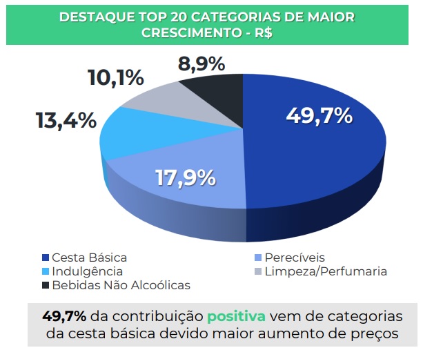 Outras categorias que, juntamente com café e leite, també, foram responsáveis por 50% do aumento médio de todo o varejo industrializado em junho de 2022 em relação ao mesmo período do ano passado são: cervejas (12%), óleo (25%), biscoito, açúcar, refrigerante, açougue - aves, sabão em pó, ovos, iogurte, chocolates, papel higiênico e margarina.