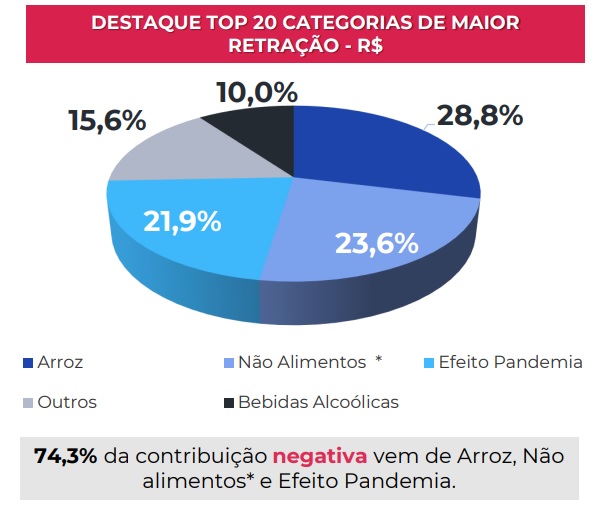 O Estado de São Paulo registrou o maior crescimento nas vendas, de 14,4%, enquanto o Nordeste é a única região que cresceu apenas um dígito em valor (8,9%). Ressaltando que a inflação geral já está perto dos 12% e o índice de alimentos no domicílio, em 16,4%. Na contramão dos insumos de cesta básica, Arroz é a categoria de principal retração com redução de 15% em preço neste mês.