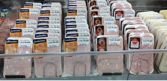- No balcão de frios ou no expositor de fatiados em bandejas, posicione o Levíssimo entre o peito de peru e o presunto;