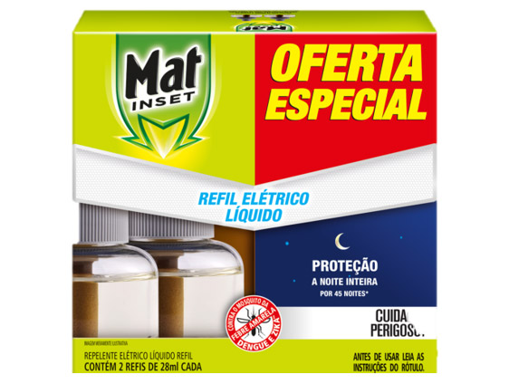 Uma das novidades da Flora para essa temporada é o pack promocional com duas unidades do refil elétrico líquido Mat Inset (foto abaixo). O produto caiu no gosto dos consumidores e, com a embalagem promocional, seu supermercado incentiva o aumento do tíquete médio na categoria.
