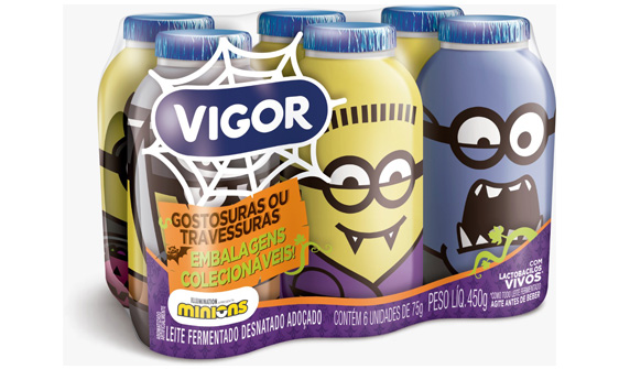 Além das crianças nos primeiros anos de vida, a categoria de leite fermentado é muito consumida por meninas e meninos com idade entre 7 e 12. Nos últimos anos, o produto tem registrado aumento no número de compradores. Para incentivar ainda mais as vendas, a Vigor traz 9 embalagens colecionáveis, cada uma com um personagem de Minions vestido como um monstrinho diferente. Ao todo, são 9 personagens para garantirem a diversão: Esqueleto, Glad, Vamp, Pirata, Monstro, Bombe, Gato, Aracno e Uni.