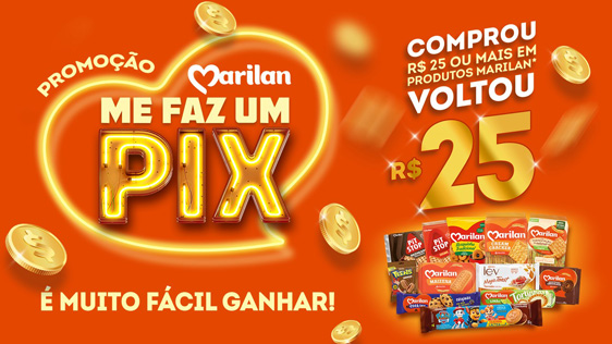 A Marilan decidiu fazer um Pix para quem comprar seus produtos. A promoção “Marilan, me faz um Pix”, que está valendo até o dia 30 de abril, vai devolver R$ 25 aos clientes que fizerem compras acima de R$ 25 de produtos participantes, que inclui o portfólio inteiro das marcas Marilan, Pit Stop, Lev, Teens e Da Hora.