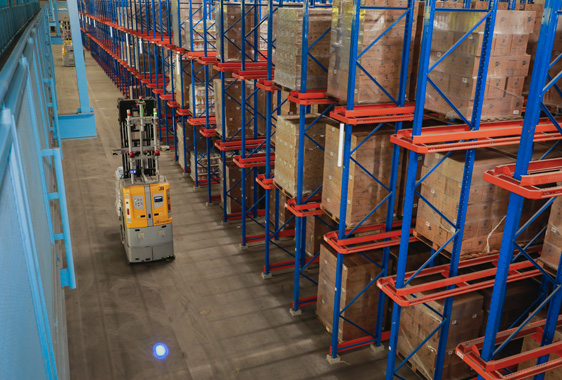 Os robôs levantam cargas de até 12 metros e elevam os paletes para as estantes mais altas. Cada tipo de equipamento tem uma função. Alguns robôs só recebem a carga, outros a movimenta na horizontal ou vertical. No estoque, são 13 níveis que chegam a totalizar 33 metros de altura.