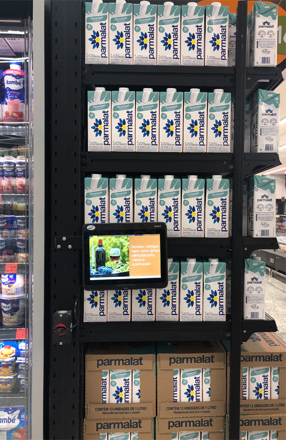 6 Utilizar dispositivos digitais para se comunicar com o consumidor contribui para uma loja visualmente mais limpa e permite mudanças rápidas de conteúdo. Além de melhorar a experiência de compras, impacta em produtividade e custo. Na nova loja do Sonda, há telas grandes e menores, como esses tabletes acoplados às gôndolas.