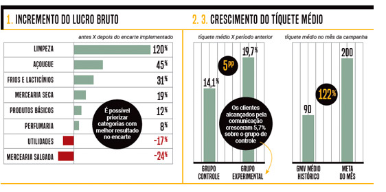 O gráfico 1 mostra , a partir de levantamento de dados para um cliente, alta do lucro bruto nas seções que tiveram produtos veiculados em encarte. Os de limpeza tiveram o maior crescimento: 120%, enquanto os de utilidades não tiveram o aumento esperado Com o CRM, é possível realizar campanhas para incentivar o aumento do consumo mensal médio entre grupos de shoppers. Em uma delas, realizada em maio deste ano (gráfico 2), houve alta de 5,7% do tíquete médio dos clientes que receberam comunicação via mobile. Já o gráfico 3 traz os resultados obtidos em uma ação desenhada para pessoas que não visitavam o supermercado há algum tempo ou deixaram de comprar determinadas categorias. Esses clientes também foram identificados a partir de dados do CRM e podiam ganhar um bônus extra em compras acima de R$ 200 na loja. Durante o mês da campanha, o tíquete médio dos clientes que receberam comunicação por aplicativo cresceu 122%.