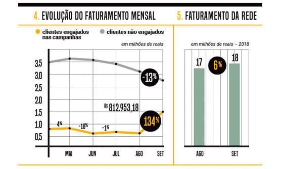 Outra campanha foi realizada com um grupo selecionado cujo consumo médio era padrão no ano e estabeleceram-se metas para aumento do valor da compra média no mês, com bônus como prêmio. Assim, os clientes que mesclaram redes foram estimulados a concentrar as compras no mesmo supermercado. As ações foram personalizadas, e o bom resultado do uso de dados levou ao aumento de 6% na receita no período das ações. No grupo dos engajados, a venda cresceu 134%. Como vimos, manter milhares de informações armazenadas não traz ganho, apenas custo. Daí a importância de “transformá-las” em ações que gerem mais vendas, margem e tíquete médio, além do aumento da fidelidade.
