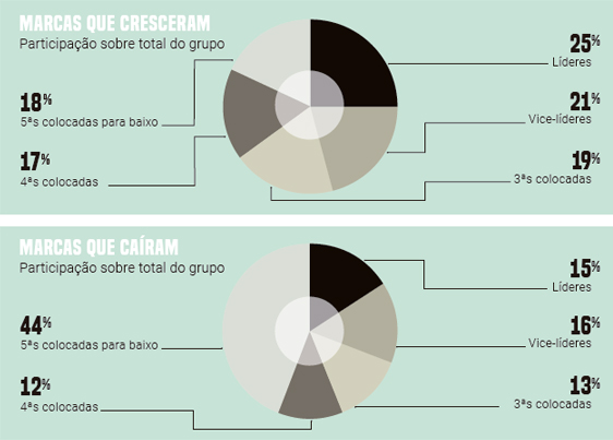 Entre as marcas que cresceram, as líderes e vice-líderes se destacaram, enquanto as posicionadas abaixo da quinta colocação foram as que mais caíram no índice de lembrança do varejo