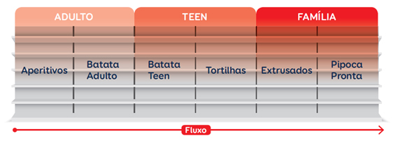 Já os extrusados de milho ficam no final da gôndola, pois é um segmento gerador de fluxo, com alta frequência de compra e, assim, o shopper navega por todo o corredor de snacks.