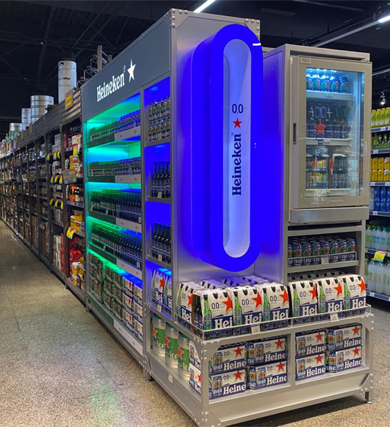 Projeto feito sob medida para uma das lojas Pão de Açúcar, em São Paulo, traz cada SKU da Heineken 0.0 e versões geladinhas