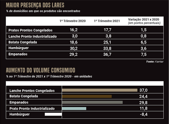 Estudo da Kantar mostra o tremendo aumento da penetração dos produtos nos lares e do volume tanto no ano passado quanto nos primeiros meses de 2021. Com exceção dos hambúrgueres, que, mesmo conquistando novos lares, caíram bastante em volume no primeiro trimestre deste ano, as demais categorias têm dado um show. Num cenário de trade down, a indústria tem colocado no mercado produtos de alto valor agregado que geram vendas e melhores margens.