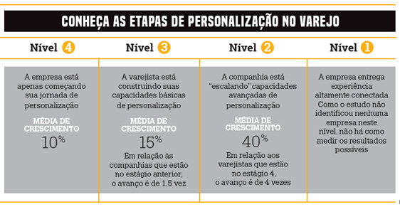 Embora compreendam sua importância estratégica, muitos varejistas não têm uma visão do que a personalização significa para os negócios ou contam com um plano para dar suporte a iniciativas que a tenham como objetivo. Também não costumam oferecer exemplos práticos de aplicações que sustentem a continuidade dos investimentos em tecnologia e pessoas para personalizar as ações. Determinar o grau ideal de personalização (do mais avançado para o menos avançado) para segmentos de clientes e pontos de contato é fundamental para gerar valor ao cliente e ao varejo.