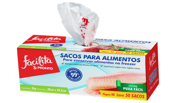 Também pensando em gerar uma melhor experiência ao consumidor, a marca lançou Sacos para Alimentos com exclusivo sistema Puxa Fácil, que inativa 99% dos vírus e bactérias. Dessa forma, minimiza a possibilidade de contaminação dos alimentos antes de ir ao freezer ou geladeira. Está disponível em três versões com 2kg, 3kg e 5kg de capacidade. E quando acabar, basta o consumidor preservar a embalagem e comprar o refil.