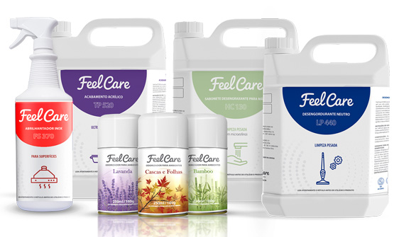 No segmento de limpeza profissional, a Feel Care também possui a linha de odorizadores, limpadores especiais, tratamentos de pisos e desinfetantes para todas as áreas, sempre oferecendo variedade de produtos de alta qualidade com a diluição exata para gerar o melhor resultado sem desperdício.