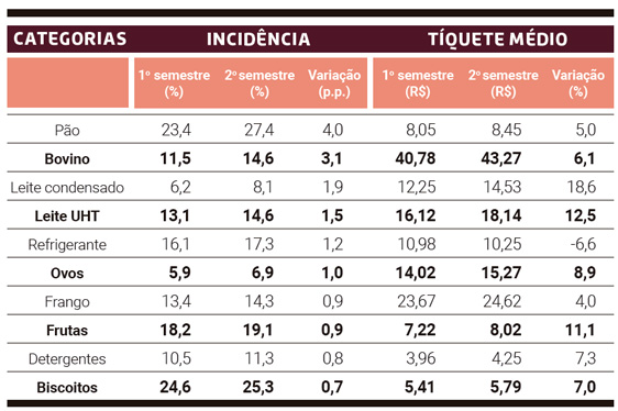Algumas categorias se destacaram no aumento de incidência na cesta de compras durante o último ano nos supermercados das regiões do Espírito Santo, Minas Gerais e Rio de Janeiro, de acordo com levantamento da Horus. Entre elas estão pão, carne bovina, leite UHT e leite condensado (vide tabela). A incidência registra a presença percentual dos produtos nas cestas de compra, ou seja, se mais carrinhos contêm esses produtos, não, necessariamente, que houve maior volume de vendas, conforme ressalta Luiza Zacharias, diretora de novos negócios da Horus e uma das responsáveis pelo levantamento das estatísticas da empresa.