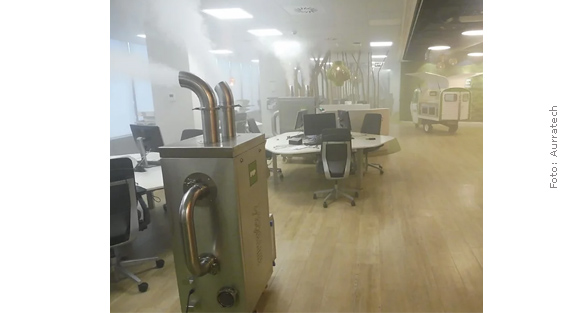 Uma delas é a startup Aurratech , que desenvolveu uma tecnologia própria chamada de "fog in place". Consiste em transformar os produtos químicos com alto poder de limpeza em uma névoa seca que cobre 100% do local a ser descontaminado.