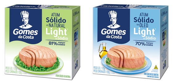 Os atuns selecionados da linha Light em Sódio da Gomes da Costa ficam armazenados em embarcações frigoríficas, sem receber adição de salmoura. Esse processo garante uma redução de até 81% no teor de sódio, em comparação com os pescados conservados em sal. Esse diferencial está bem destacado nas novas embalagens.