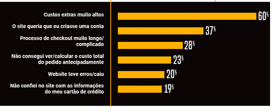 Quase 70% é a taxa média de abandono de carrinhos nas compras online. O dado é do Baymard Institute , num cálculo que envolve 40 estudos dos EUA e do Reino Unido sobre compras eletrônicas não realizadas. Um dos entraves (processo do checkout longo e complicado) pode ser resolvido com a redução do número de elementos de formulário (etapas para finalizar a compra). Sarah McCluskey, gerente de marketing da Global Payments , que atua com soluções de pagamentos para comércio online, concorda. Ela sugere três etapas, antes que o botão de compra final seja clicado. Para outro problema (falta de confiança no site para pagamento com cartão), a executiva sugere exibir a certificação SSL, além dos logotipos de segurança e de cartão de crédito em todo o site, não apenas na página de pagamento.