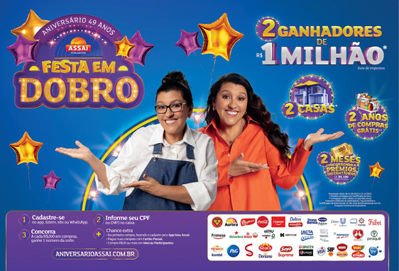 Com a campanha “Festa em Dobro”, o Assaí irá sortear prêmios de R$ 1 milhão, casas próprias, dois anos de compras grátis e presentes instantâneos por dois meses todos os dias. As recompensas fazem parte da comemoração de 49 anos da rede e de acordo com representantes do grupo é uma das maiores iniciativas de marketing da história do Assaí.