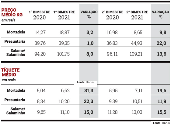 Parte do crescimento da receita nos embutidos vem dos repasses para compensar o aumento do custo de produção. Entretanto, outra parcela corresponde ao investimento dos fabricantes em versões de maior valor agregado, que ajudam elevar o tíquete médio. Confira os dados abaixo da pesquisa da Horus: