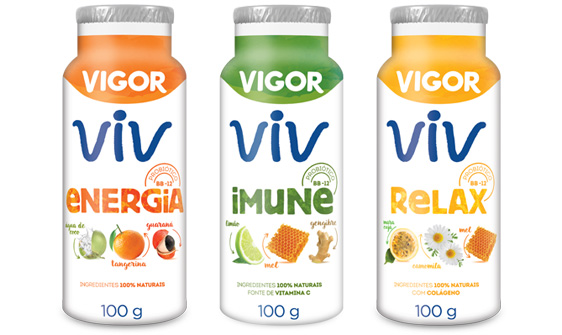 Quem se fortalece nesse mercado é a Vigor, que lançará a partir de abril o Viv Shot, leite fermentado com probióticos BB12, disponível em três versões: Energia, com água de coco, tangerina e guaraná; Relax, cuja receita leva maracujá, camomila e mel; e Imune, que combina limão, mel e gengibre. Todos eles garantem benefícios funcionais e podem ser consumidos em dose diária em qualquer momento do dia.