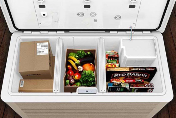 A caixa inteligente HomeValet funciona mediante uma plataforma de Internet das Coisas (IoT) com três zonas de temperatura controlada, para que possa armazenar com eficiência produtos congelados, refrigerados e secos.